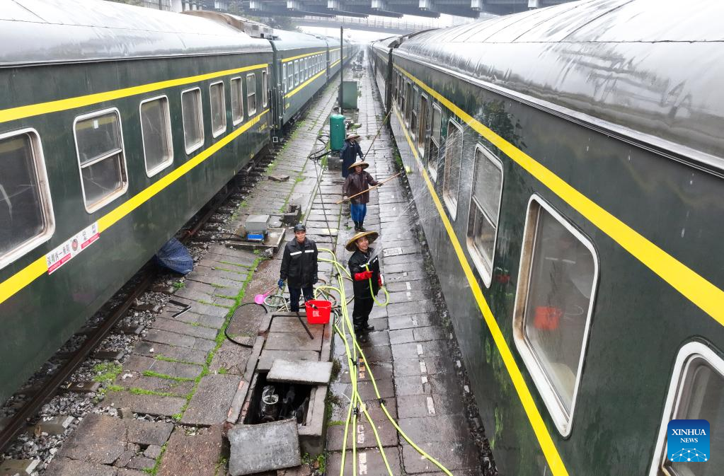 Aerial photo taken on Jan. 16, 2022 shows staff members cleaning train carriages at a service garage in Hengyang, central China's Hunan Province. The Spring Festival travel rush, China's largest annual travel rush, will last from Jan. 17 to Feb. 25 this year. During the 40-day travel season, also known as chunyun, many Chinese people will travel to meet their families for the Chinese Lunar New Year, or Spring Festival, which will fall on Feb. 1, 2022. (Photo by Cao Zhengping/Xinhua)