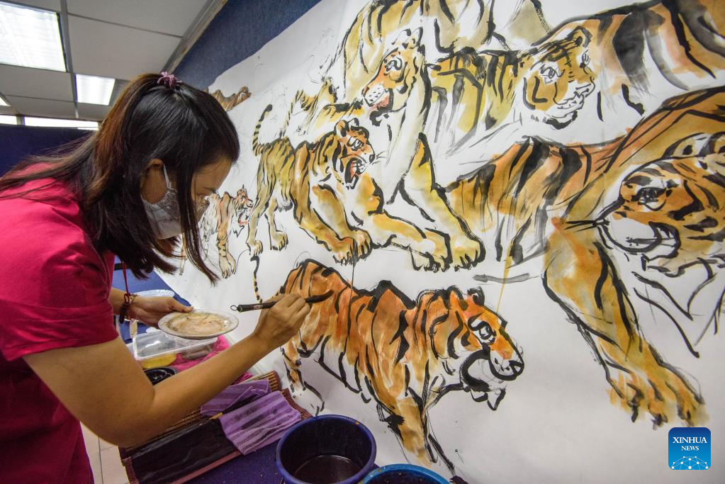 A painter creates tiger paintings in Klang of Selangor states, Malaysia, Dec. 30, 2021. An art project composed of 2,022 tiger paintings and 2,022 Chinese characters of Hu, meaning tiger, by local artists and enthusiasts was displayed here on Jan. 16, 2022 to welcome the upcoming Chinese zodiac Year of the Tiger. (Photo by Chong Voon Chung/Xinhua)