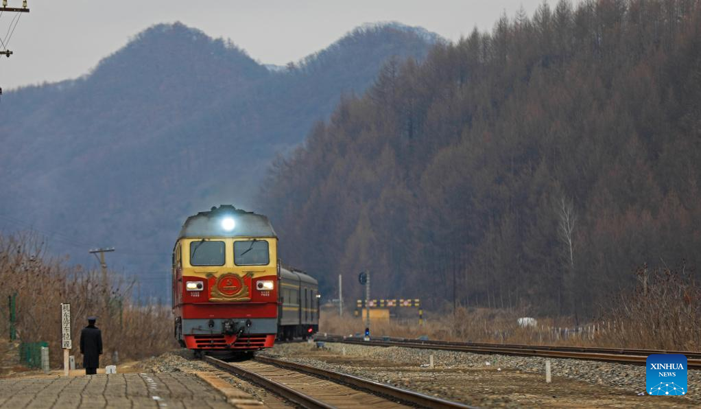 Photo taken on Jan. 15, 2022 shows train No. 4318 arriving at Shicheng Station in Fengcheng City, northeast China's Liaoning Province. Trains No. 4317 and 4318 are "slow trains" operating between Tonghua of Jilin Province and Dandong of Liaoning Province in northeast China. In the run-up to the Lunar New Year, the local railway authorities have been organizing onboard markets which allow villagers living along the trains' route to sell goods to passengers without leaving the train cars. (Xinhua/Yang Qing)
