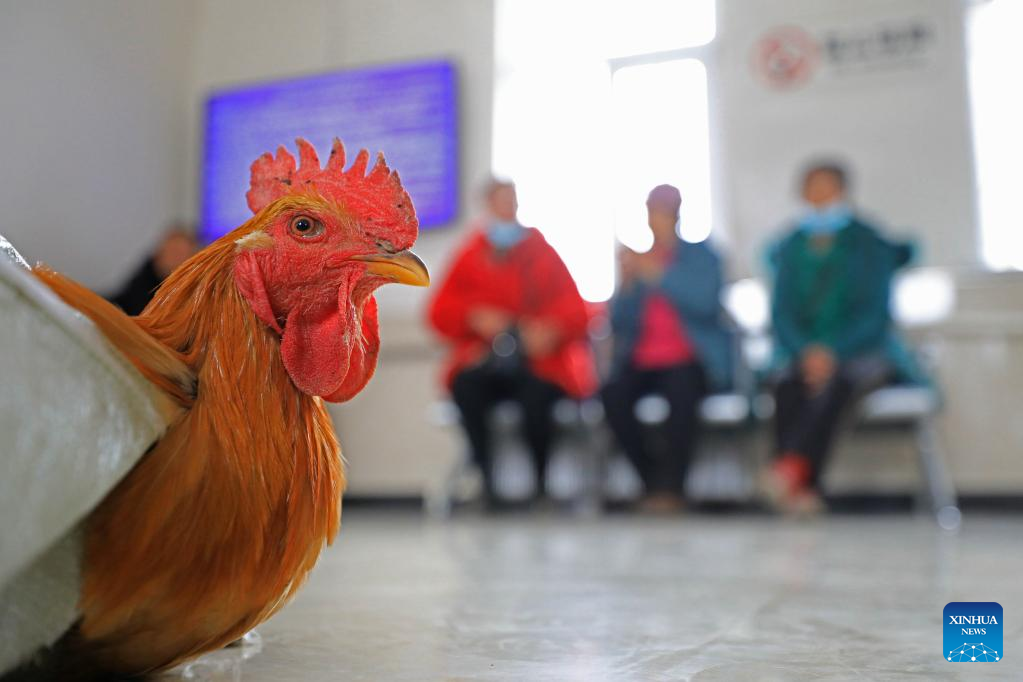 A rooster for sale on a "slow train" is seen at Shicheng Station in Fengcheng City, northeast China's Liaoning Province, Jan. 15, 2022. Trains No. 4317 and 4318 are "slow trains" operating between Tonghua of Jilin Province and Dandong of Liaoning Province in northeast China. In the run-up to the Lunar New Year, the local railway authorities have been organizing onboard markets which allow villagers living along the trains' route to sell goods to passengers without leaving the train cars. (Xinhua/Yang Qing)