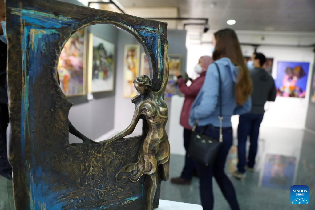 People visit an art exhibition during Egypt's 1st World Art Forum in Cairo, Egypt, on Jan. 16, 2022. (Xinhua/Ahmed Gomaa)