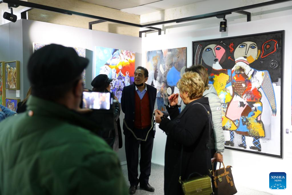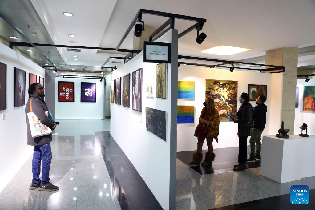 People visit an art exhibition during Egypt's 1st World Art Forum in Cairo, Egypt, on Jan. 16, 2022. (Xinhua/Sui Xiankai)