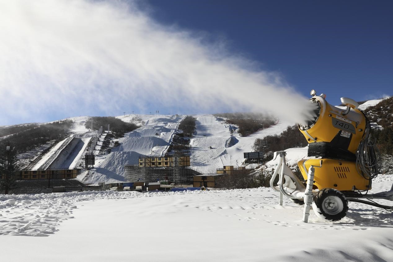 A machine is making snow at the Genting Snow Park in Zhangjiakou competition zone of the Beijing 2022 Olympic and Paralympic Winter Games, in Zhangjiakou, north China’s Hebei province, Dec. 6, 2021. (People’s Daily Online/ Wu Diansen)