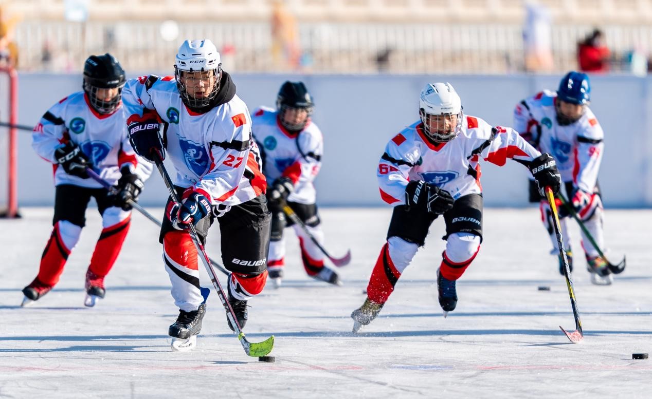 Ice hockey enthusiasts practice at a skating rink in Hohhot, north China’s Inner Mongolia autonomous region, Jan. 1, 2022. (People’s Daily Online/Ding Genhou)