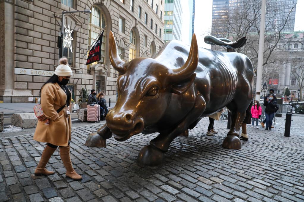 A woman walks past the Wall Street Charging Bull in New York, the United States, Dec. 21, 2020. (Xinhua/Wang Ying)