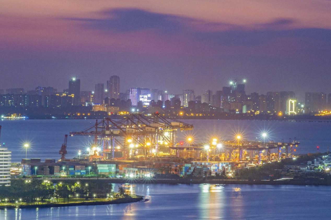 Containers are loaded and unloaded at a well-lit container terminal of Haikou port, south China’s Hainan province, Oct. 20, 2021. (People’s Daily Online/ Wang Chenglong)