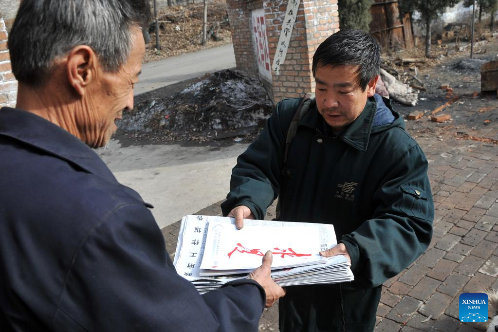 File photo taken on March 16, 2010 shows Wan Shouqiu delivering newspapers to a villager. Located in a remote mountainous area in Wanbailin District of Taiyuan, Wangfeng Township had long suffered from poor transport infrastructure. In 1985, Wang Shouqiu became a postman of China Post serving Wangfeng Township, and held his post until a position transfer in 2020 due to his bad health condition.
