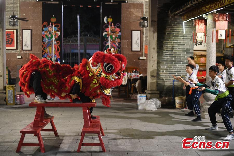 Lion dancers practice at Sugong Temple in Qingchuan, Guangzhou, South China's Guangdong Province, Jan. 18, 2022. As the Spring Festival approaches, team members are making their efforts to improve their skills. (Photo: China News Service/Chen Chuhong)