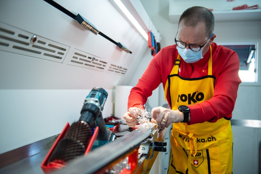A waxer works in China's first ski wax truck with independent intellectual property in Beijing, capital of China, Oct. 27, 2021. (Xinhua/Chen Zhonghao)