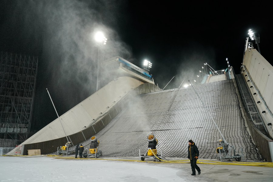 A photo taken on Dec. 12, 2021 shows the snowmaking system in the Shougang Big Air venue in Beijing, capital of China. (Xinhua/Zhang Chenlin)