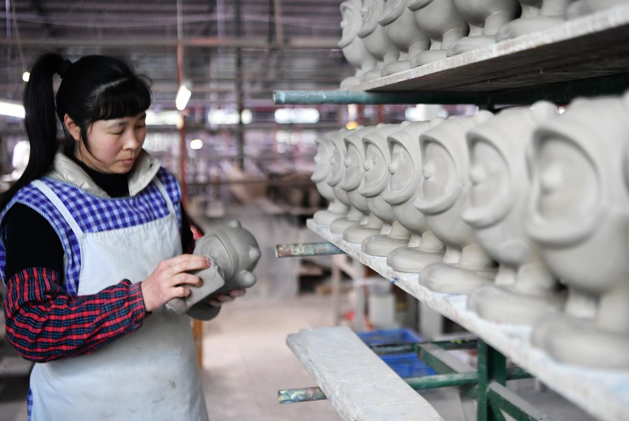 A worker works on a semi-finished porcelain figure of Bing Dwen Dwen, the mascot of Beijing 2022 Olympic Winter Games, at a porcelain factory in Dehua County of Quanzhou, southeast China's Fujian Province, Jan. 19, 2022. (Xinhua/Wei Peiquan)