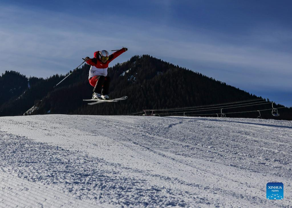 Photo taken on Jan. 11, 2022 shows Talhat Satayr skiing at Silkroad Resort in Urumqi, northwest China's Xinjiang Uygur Autonomous Region. Talhat Satayr, 45, is the captain of the ski patrol team, which provides rescue services for tourists in need, at Silkroad Resort in Urumqi of Xinjiang. During his early life, he spent most of his time on the pastures along the canyons on Tianshan Mountain. He began to work at Silkroad Resort, which is not far away from his home in Urumqi, 16 years ago. Being a ski patroller is not an easy job, yet Talhat knows well the responsibilities on the shoulders of him and his teammates. He has been sent to Italy and northeast China's Jilin Province to learn professional rescue knowledge and skills at ski resort. Just like Talhat, more and more people in Xinjiang now have benefited from the development of winter sports. (Xinhua/Hu Huhu)