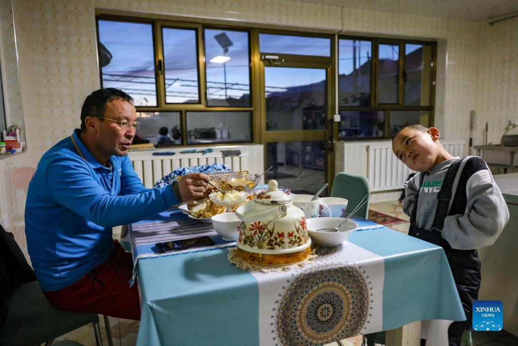 Talhat Satayr (L) has breakfast with his son at home in Urumqi, northwest China's Xinjiang Uygur Autonomous Region, Jan. 11, 2022. Talhat Satayr, 45, is the captain of the ski patrol team, which provides rescue services for tourists in need, at Silkroad Resort in Urumqi of Xinjiang. During his early life, he spent most of his time on the pastures along the canyons on Tianshan Mountain. He began to work at Silkroad Resort, which is not far away from his home in Urumqi, 16 years ago. Being a ski patroller is not an easy job, yet Talhat knows well the responsibilities on the shoulders of him and his teammates. He has been sent to Italy and northeast China's Jilin Province to learn professional rescue knowledge and skills at ski resort. Just like Talhat, more and more people in Xinjiang now have benefited from the development of winter sports. (Xinhua/Hu Huhu)