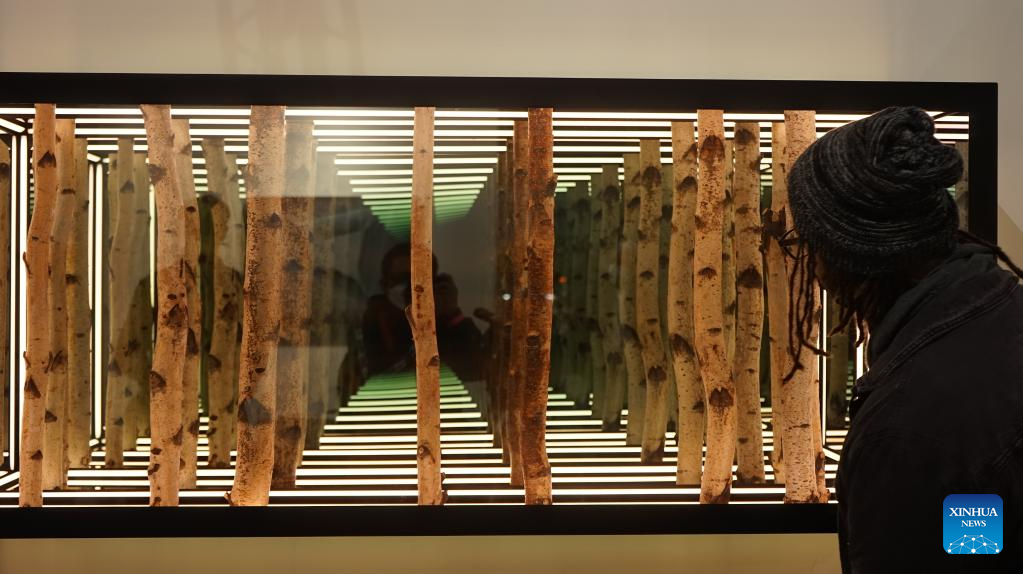 A person visits the LA Art Show in Los Angeles, the United States, Jan. 19, 2022. LA Art Show, the most comprehensive international contemporary art show in America, returned to the Los Angeles Convention Center as an in-person event on Wednesday evening despite the ongoing COVID-19 pandemic. (Photo by Zeng Hui/Xinhua)