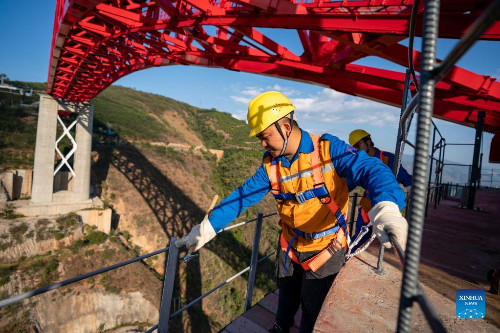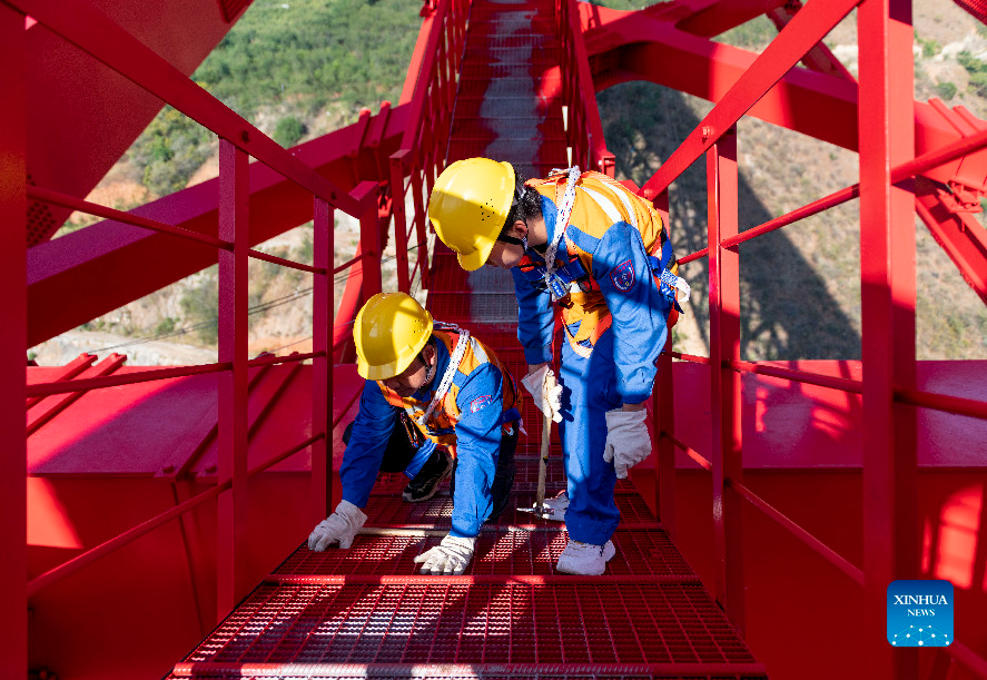 Shi Pengbin (L) and his colleague work on the Yuanjiang major bridge over the Yuanjiang River in southwest China's Yunnan Province, Jan. 18, 2022. Shi Pengbin, 28, is a technician responsible for maintaining the Yuanjiang major bridge, a key bridge of the China-Laos Railway project. Spanning a full length of 832.2 meters, the Yuanjiang bridge uses six bridge piers with the No.3 bridge pier, the highest pier, standing at 154 meters. Shi, who started working for the construction of the China-Laos Railway from April 2020, even postponed his wedding to guarantee on-time completion of the bridge. After the operation of China-Laos Railway, Shi's work includes checking the bridge in high places during the day, and repairing the bridge floor during the break time for rail service at night. During this year's Spring Festival holiday, Shi and his colleagues will stick to their posts to secure the railway transportation. (Xinhua/Chen Xinbo)