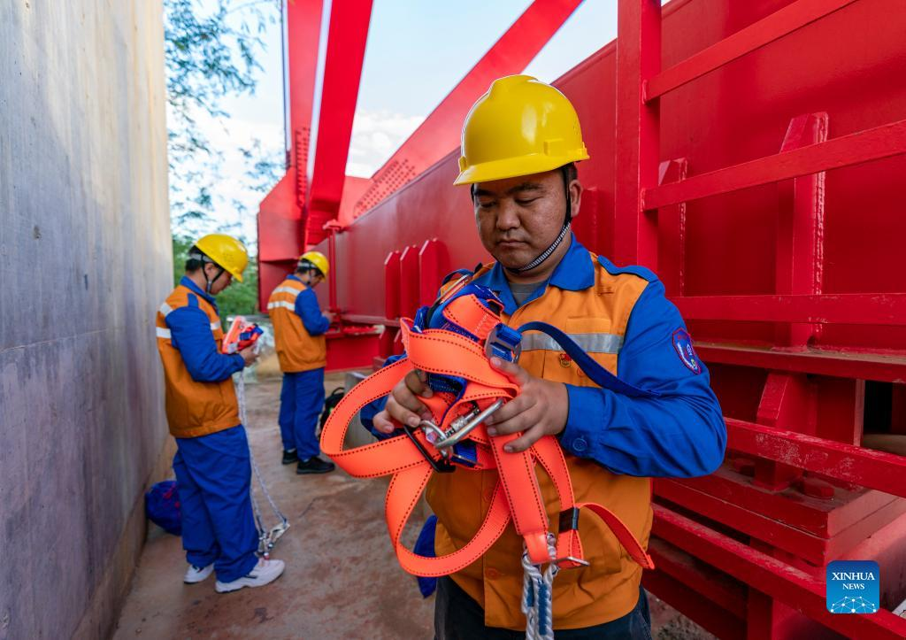 Shi Pengbin (R) and his colleague prepare to maintain the Yuanjiang major bridge over the Yuanjiang River in southwest China's Yunnan Province, Jan. 18, 2022. Shi Pengbin, 28, is a technician responsible for maintaining the Yuanjiang major bridge, a key bridge of the China-Laos Railway project. Spanning a full length of 832.2 meters, the Yuanjiang bridge uses six bridge piers with the No.3 bridge pier, the highest pier, standing at 154 meters. Shi, who started working for the construction of the China-Laos Railway from April 2020, even postponed his wedding to guarantee on-time completion of the bridge. After the operation of China-Laos Railway, Shi's work includes checking the bridge in high places during the day, and repairing the bridge floor during the break time for rail service at night. During this year's Spring Festival holiday, Shi and his colleagues will stick to their posts to secure the railway transportation. (Xinhua/Chen Xinbo)