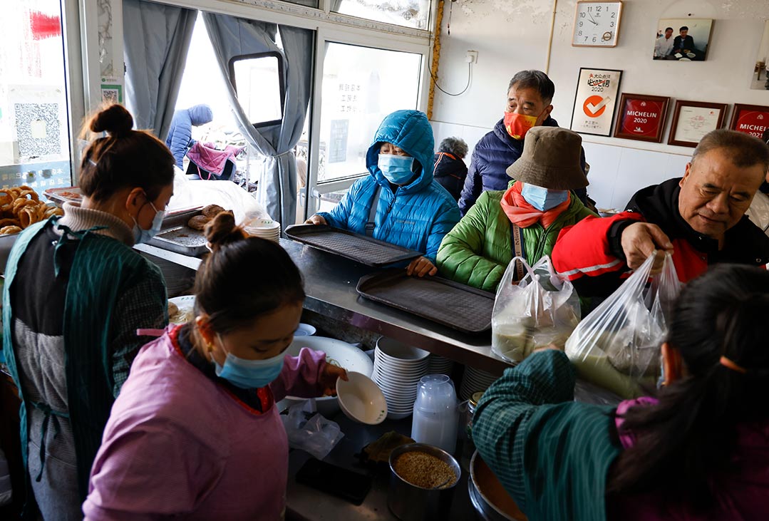 Staffs serve douzhi to customers at a restaurant in Beijing, Nov. 26, 2021. (People’s Daily Online/Peng Yukai)