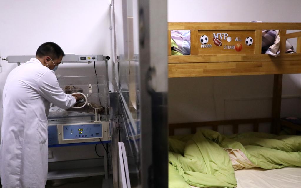 Staff member Lei Shengqiao lives with twin cubs of south China tiger at the research base of south China tiger breeding in Shaoguan City of south China's Guangdong Province, Jan. 20, 2022. Mengmeng, a south China tiger, gave birth to twin cubs on Dec. 31, 2021 after its two cubs Yuanyuan and Qingqing were born in March and September 2021. (Xinhua/Huang Guobao)