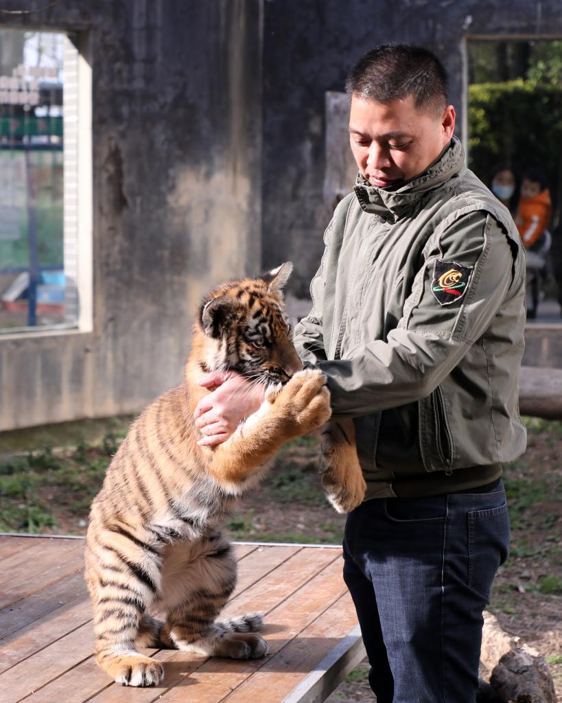 South China tiger Qingqing born in September 2021 plays with staff member Lei Shengqiao at the research base of south China tiger breeding in Shaoguan City of south China's Guangdong Province, Jan. 20, 2022. Mengmeng, a south China tiger, gave birth to twin cubs on Dec. 31, 2021 after its two cubs Yuanyuan and Qingqing were born in March and September 2021. (Xinhua/Huang Guobao)