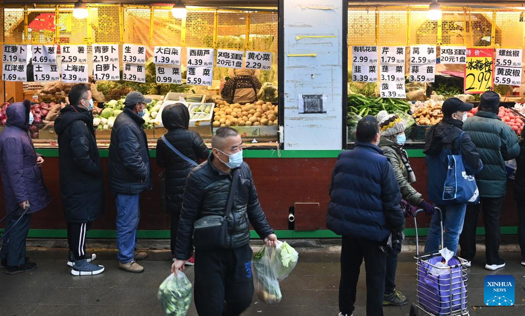 Citizens buy vegetables at a market in Beilin District of Xi'an, northwest China's Shaanxi Province, Jan. 23, 2022. (Xinhua/Tao Ming)