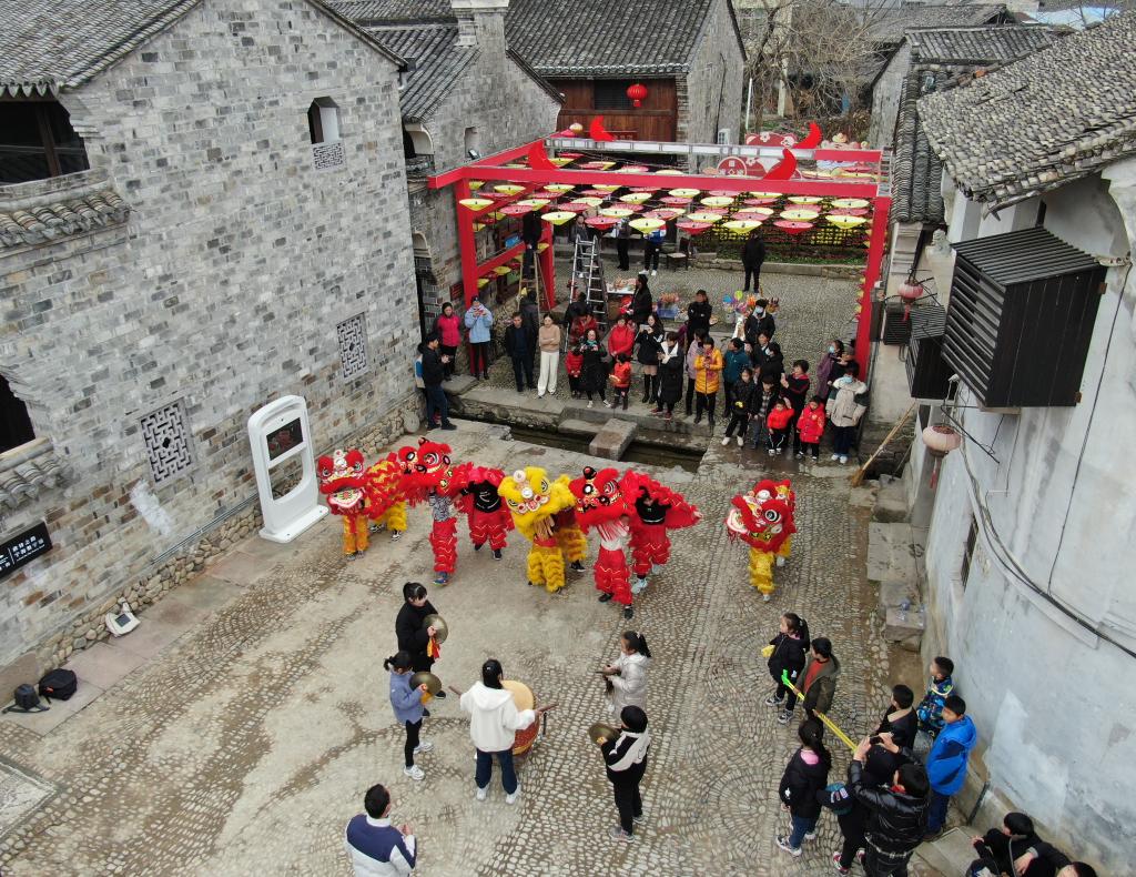 The lion dance team trains at Qiantong ancient town in Ninghai County, east China's Zhejiang Province, Jan. 20, 2022. Tong Panfeng is an enthusiast of lion dance. At the age of 26, he quit his job to learn lion dance all over the country. In 2016, with the support of the local government, Tong returned to his hometown to promote the lion dance into school activities with an aim to help primary and middle school students keep fit and inherit the traditional culture. Thanks to the efforts of Tong, many local primary and middle school students joined the lion dance team of the town and they often practice lion dance in their spare time. In recent years, this team has achieved good results in provincial and national championships for many times.Lion dance is not only a sport but also a cultural tradition which has made the the ancient town full of vitality. (Xinhua/Weng Xinyang)