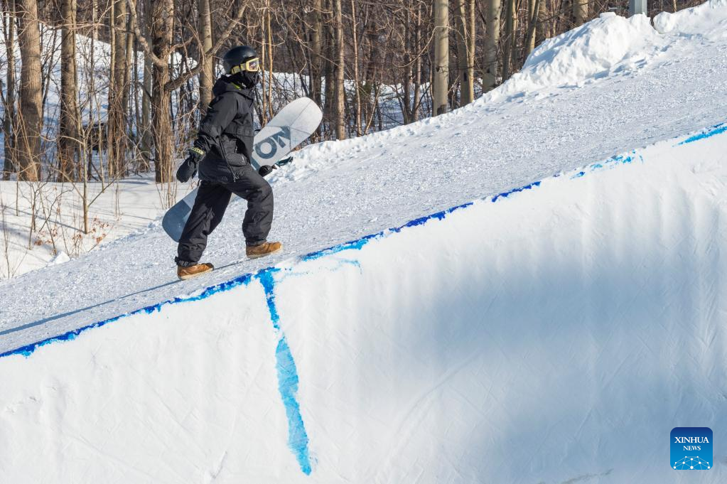 A skier from Heilongjiang Province walks on the edge of halfpipe in a training session at Yabuli Ski Resort in Harbin, northeast China's Heilongjiang Province, Jan. 21, 2022. Yabuli, located in northeastern China, is the cradle of Chinese winter sports. Boasting a professional ski area, Yabuli Resort hosted many national, continental and international winter games like FIS snowboard world cup, World Winter Universiade and the Asian Winter Games. (Xinhua/Xie Jianfei)
