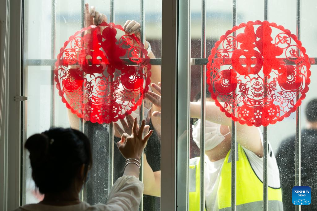 Staff members of the China-Laos Railway Luang Prabang Operation Management Center paste paper-cutting artworks on windows at the center in Luang Prabang, Laos, Jan. 22, 2022. China-Laos Railway Luang Prabang Operation Management Center, run by China Railway Kunming Group, held celebration activities on Sunday for the upcoming Chinese Lunar New Year. (Photo by Kaikeo Saiyasane/Xinhua)