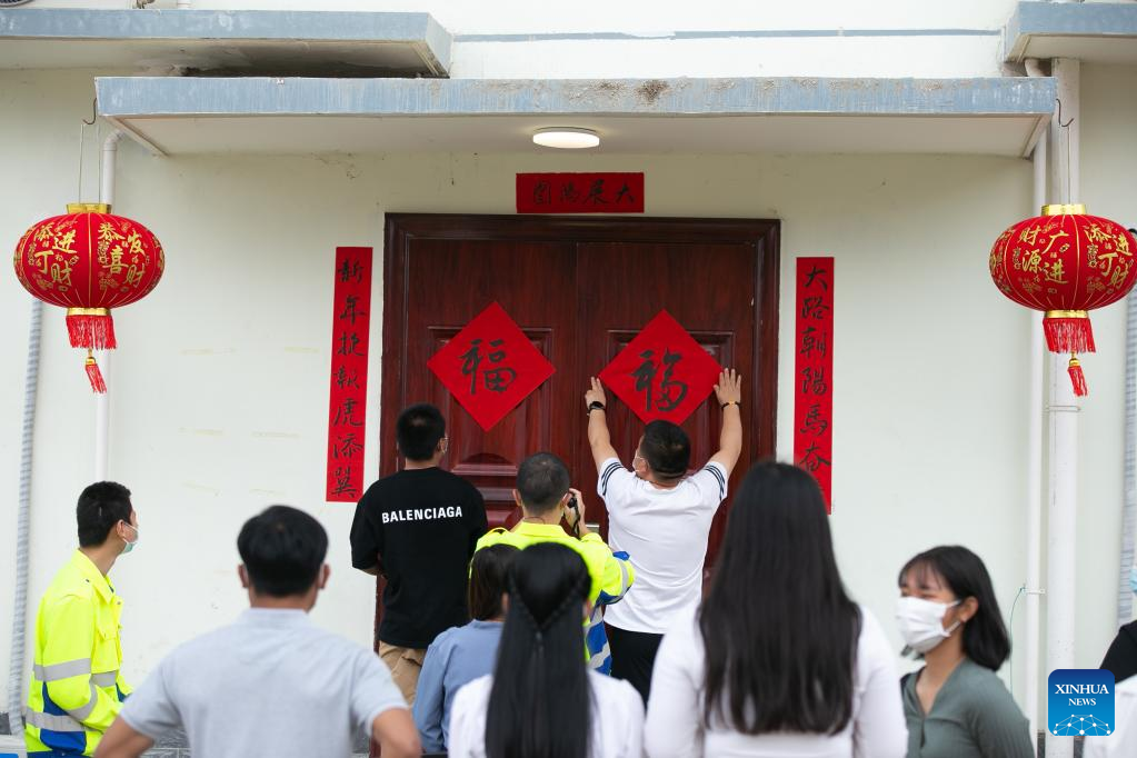 Staff members of the China-Laos Railway Luang Prabang Operation Management Center paste Chinese calligraphy Fu, which means good fortune, on doors in Luang Prabang, Laos, Jan. 22, 2022. China-Laos Railway Luang Prabang Operation Management Center, run by China Railway Kunming Group, held celebration activities on Sunday for the upcoming Chinese Lunar New Year. (Photo by Kaikeo Saiyasane/Xinhua)