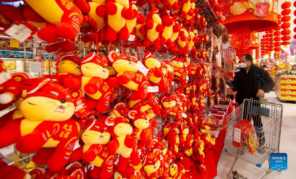 A man wearing a face mask shops at a Chinese supermarket with decorations marking the upcoming Chinese Lunar New Year in Toronto, Canada, on Jan. 22, 2022. (Photo by Zou Zheng/Xinhua)
