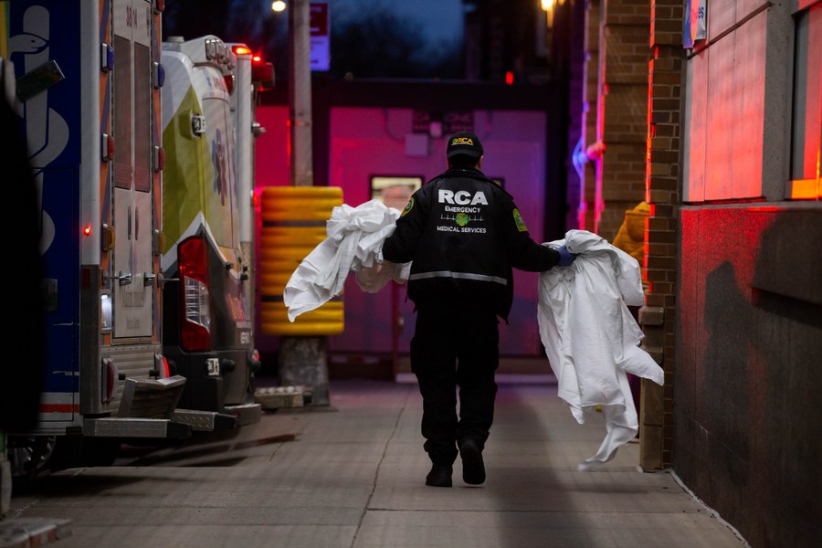 A health worker carries soiled sheets and towels in front of the Maimonides Medical Center in New York, the United States, Jan. 5, 2021. (Photo by Michael Nagle/Xinhua)