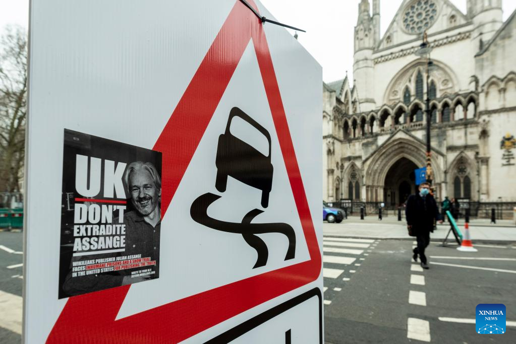 A sticker with a photo of WikiLeaks founder Julian Assange is seen on a road sign outside the Royal Courts of Justice in London, Britain, on Jan. 24, 2022. Assange has won permission from a court here to appeal against his extradition from the United Kingdom (UK) to the United States, where he faces espionage charges. (Photo by Stephen Chung/Xinhua)