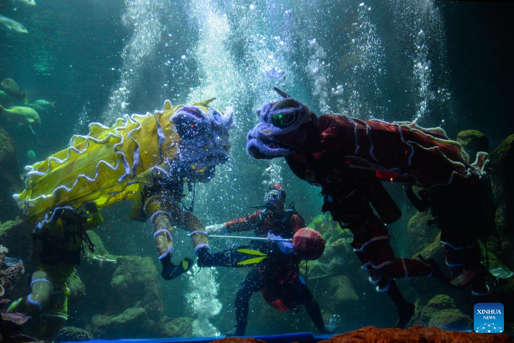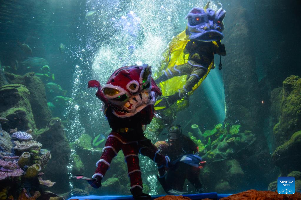 Divers perform lion dance under water in celebration of the upcoming Chinese Lunar New Year at Sea World Ancol in Jakarta, Indonesia, Jan. 24, 2022. (Xinhua/Xu Qin)