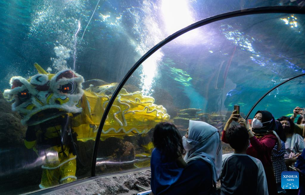 Visitors take photos of divers performing lion dance under water in celebration of the upcoming Chinese Lunar New Year at Sea World Ancol in Jakarta, Indonesia, Jan. 24, 2022. (Xinhua/Xu Qin)