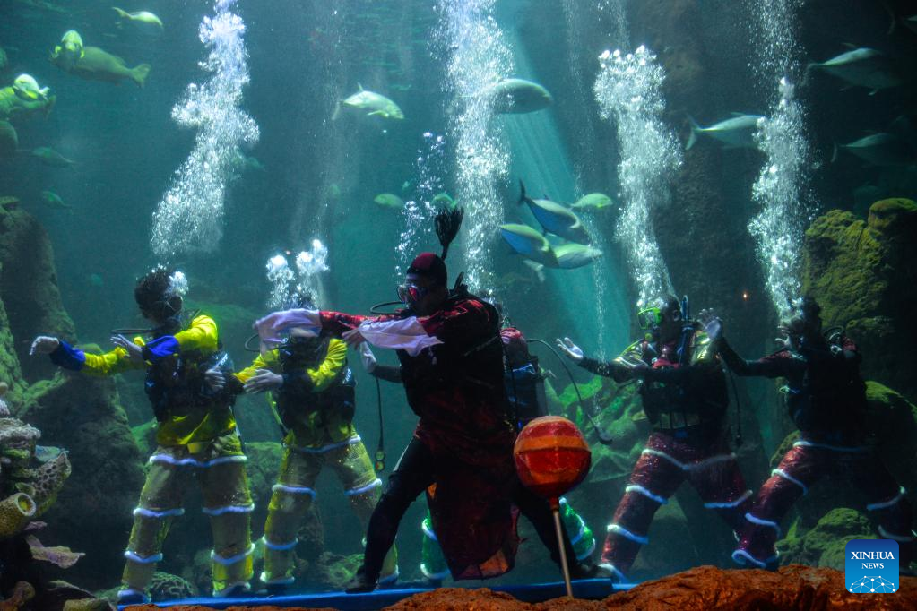Divers perform under water in celebration of the upcoming Chinese Lunar New Year at Sea World Ancol in Jakarta, Indonesia, Jan. 24, 2022. (Xinhua/Xu Qin)