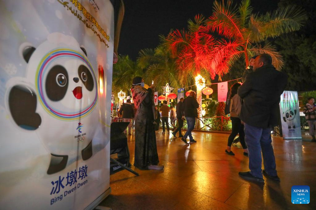 People take pictures during a light show for the Beijing Winter Olympics at the Cairo Tower in Cairo, Egypt, on Jan. 24, 2022. A light show was held at the Cairo Tower for the upcoming Beijing 2022 Winter Olympics. (Xinhua/Sui Xiankai)
