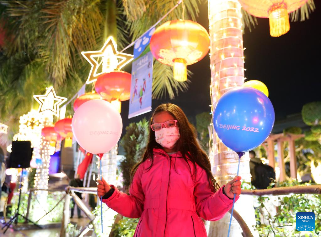 A child poses for pictures during a light show in Cairo, Egypt, on Jan. 24, 2022. A light show was held at the Cairo Tower for the upcoming Beijing 2022 Winter Olympics. (Xinhua/Wang Dongzhen)