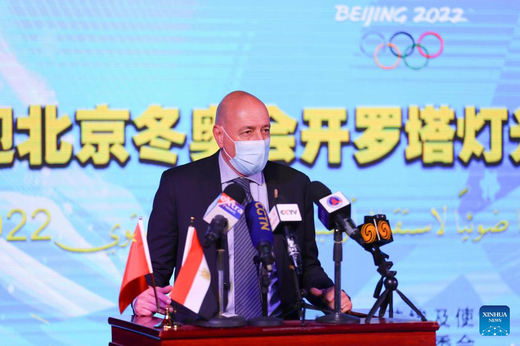 Sherif El-Erian, secretary-general of the Egyptian Olympic Committee, addresses the launching ceremony of a light show for Beijing 2022 Winter Olympics at the Cairo Tower in Cairo, Egypt, on Jan. 24, 2022. (Xinhua/Sui Xiankai)