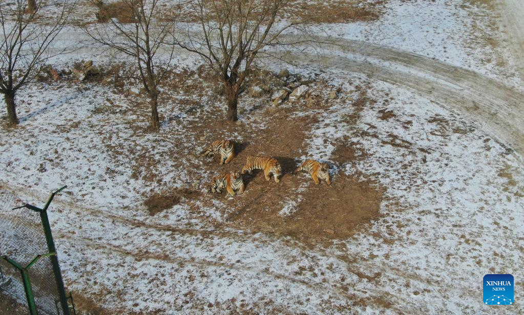 Aerial photo taken on Jan. 24, 2022 shows Siberian tigers at Guaipo Siberian Tiger Park in Shenyang, northeast China's Liaoning Province. The 2022 Chinese Lunar New Year falls on Feb. 1. It is based on a 12-year Zodiac cycle of characters, with 2022 being the Year of the Tiger. (Xinhua/Yang Qing)