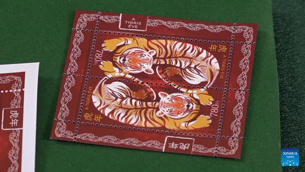 Stamps for the Year of the Tiger are seen during the inauguration ceremony in Budapest, Hungary on Jan. 25, 2022. A special zodiac stamp issued by the Hungarian Post to celebrate the Chinese New Year of the Tiger was presented to the public in Hungary on Tuesday. (China Cultural Center in Budapest/Handout via Xinhua)