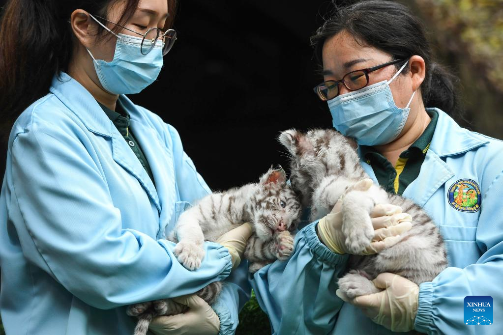 Staff members hold a pair of white tiger twins at the Chimelong Safari Park in Guangzhou, south China's Guangdong Province, Jan. 25, 2022. Consisting of a male and a female, a pair of twin white tigers which were born at the park on Dec. 6, 2021, made their debut here on Tuesday. (Xinhua/Liu Dawei)