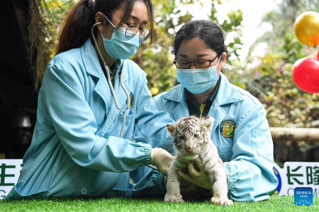 Staff members examine a white tiger cub at the Chimelong Safari Park in Guangzhou, south China's Guangdong Province, Jan. 25, 2022. Consisting of a male and a female, a pair of twin white tigers which were born at the park on Dec. 6, 2021, made their debut here on Tuesday. (Xinhua/Liu Dawei)