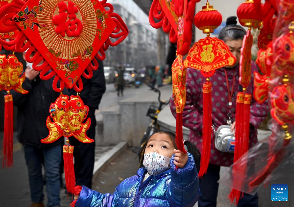 A child selects festive wall hangings in Xi'an, northwest China's Shaanxi Province, Jan. 25, 2021. Xi'an cleared all areas classified as high and medium-risk for COVID-19 on Jan. 24. (Xinhua/Tao Ming)