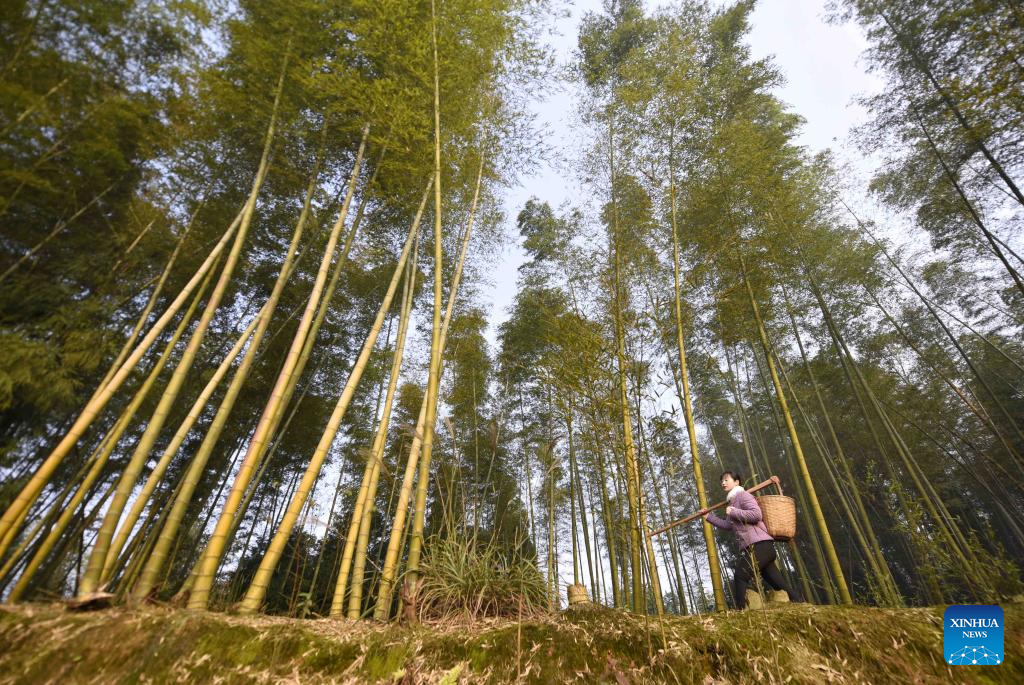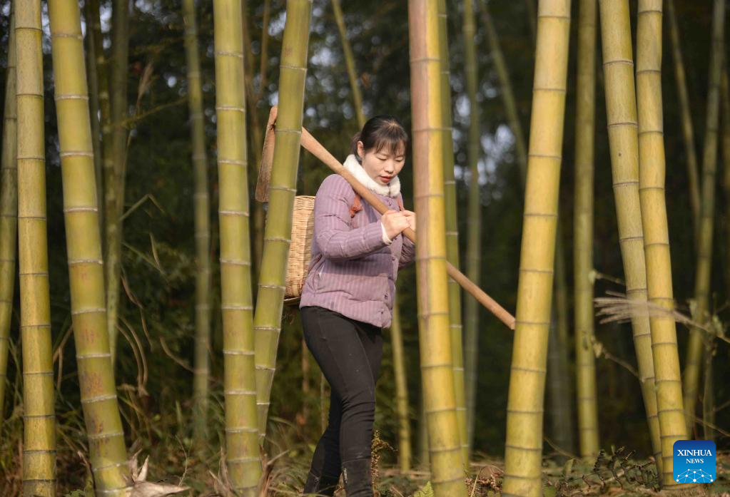 Wu Qiuyue looks for winter bamboo shoots at a bamboo forest in Zhuhai Village of Baijie Town of Naxi District, Luzhou, southwest China's Sichuan Province, Jan. 18, 2022. Years ago, Wu Qiuyue used to work in an electronics factory in south China's Shenzhen. Later, in order to take care of her parents and daughter, she and her husband Huang Zhongping decided to return to her hometown to start a business together. (Xinhua/Liu Kun)