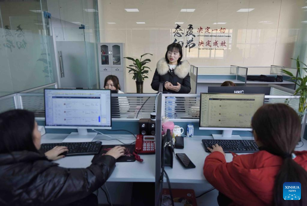 Wu Qiuyue learns about the feedback of customers in Zhuhai Village of Baijie Town of Naxi District, Luzhou, southwest China's Sichuan Province, Jan. 18, 2022. Years ago, Wu Qiuyue used to work in an electronics factory in south China's Shenzhen. Later, in order to take care of her parents and daughter, she and her husband Huang Zhongping decided to return to her hometown to start a business together. (Xinhua/Liu Kun)