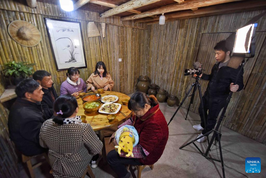 Wu Qiuyue and her family shoot a short video about their daily life in Zhuhai Village of Baijie Town of Naxi District, Luzhou, southwest China's Sichuan Province, Jan. 18, 2022. Years ago, Wu Qiuyue used to work in an electronics factory in south China's Shenzhen. Later, in order to take care of her parents and daughter, she and her husband Huang Zhongping decided to return to her hometown to start a business together. (Xinhua/Liu Kun)