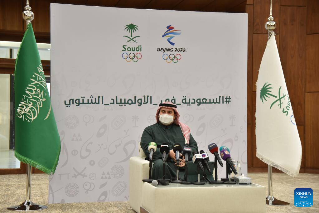 Fahad Bin Jalawi, vice-president of Saudi Olympic &Paralympic Committee, addresses a press conference in Riyadh, Saudi Arabia, Jan. 26, 2022. Saudi Arabia will send a 9-member delegation to Beijing 2022 Olympic Winter Games. (Xinhua/Wang Haizhou)