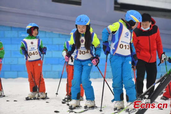 Children ski at the Sunac Snow Park in Kunming, southwest China's Yunnan Province, Jan. 26, 2022. (Photo: China News Service/Liu Yanyang)