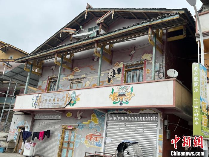 Photo shows a building with an image of a panda painted on it in the Qiaoqi Tibetan township of Baoxing county, southwest China’s Sichuan Province. (Photo/He Shaoqing)