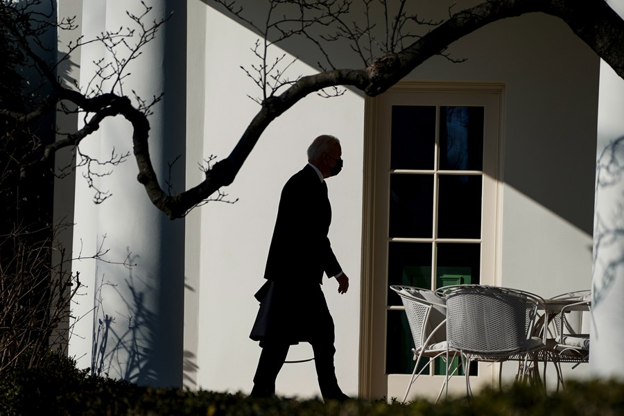 U.S. President Joe Biden arrives at the White House in Washington, D.C., the United States on Jan. 24, 2022. Biden reiterated Tuesday that there is no intention in his administration or within the North Atlantic Treaty Organization (NATO) to send troops into Ukraine, but that Russia will face serious economic consequences if it invades the former Soviet republic. (Photo by Ting Shen/Xinhua)