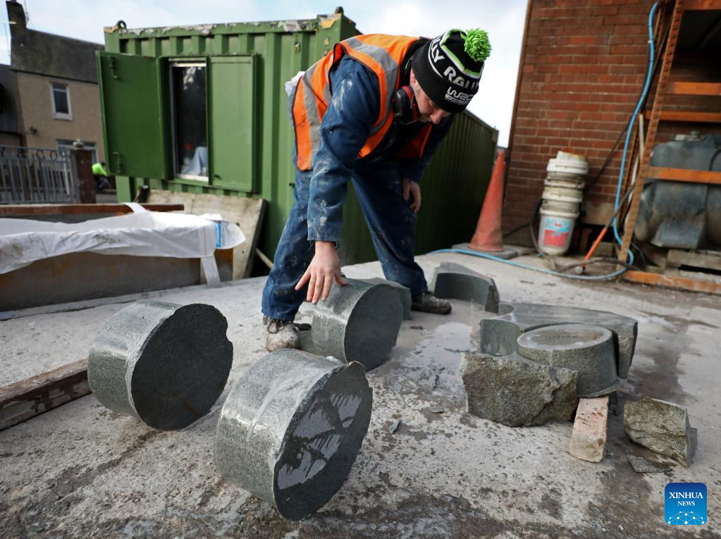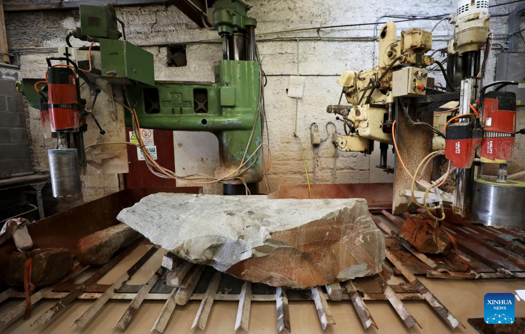 A man deals with stones which have been cut from a piece of Ailsa Craig granite in Kays Curling factory in Mauchline, Scotland, Britain, Jan. 24, 2022. Every single Olympic curling stone is made of granite from a little island off the west coast of Scotland, called Ailsa Craig. The Ailsa Craig granite is some of the hardest found in the world and maintains its shape despite grinding and wet conditions, making it perfect material for curling stone. All curling stones used at Olympic events are manufactured by Kays Curling in Mauchline, Scotland, Britain. (Xinhua/Li Ying)